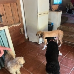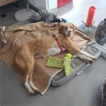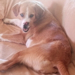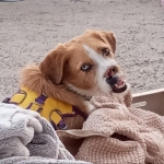 Click on an image to enlarge the picture or play the videoGoldie is a medium sized dog, very friendly and loving.Sadly part of her nose was shot away by hunters a year or so ago, and she didn’t receive any veterinary care. She came into our care along with Willow after the subsequent death of her owner. She surprised us all shortly after settling in her foster home by giving birth to 10 beautiful puppies. She is due soon to be spayed and is happy and thriving with love and care from her fosterer and the company of the other dogs in the home. She truly is a very special lady who has overcome so many things in her short life and has a lot of love to give whoever adopts her.